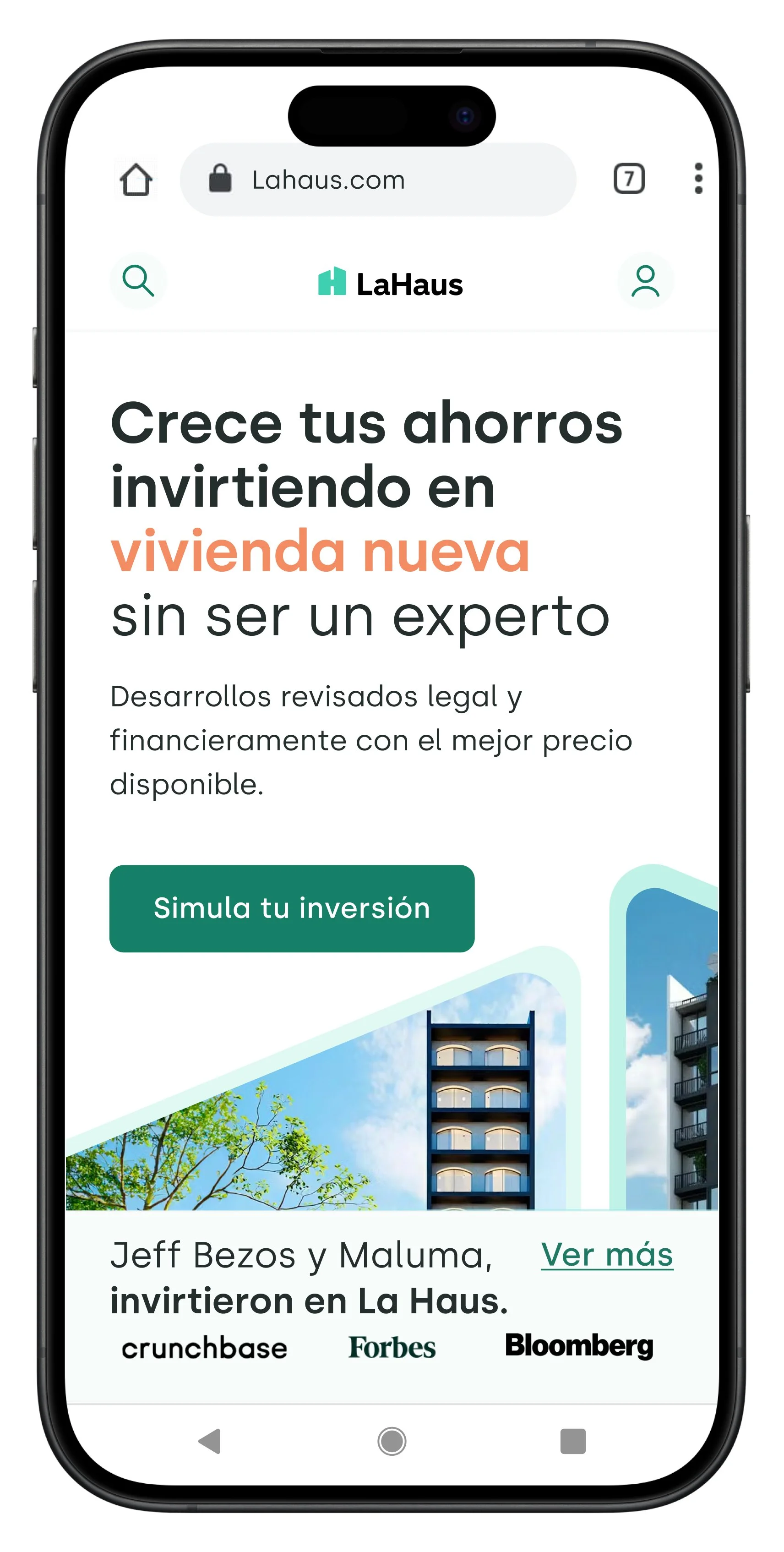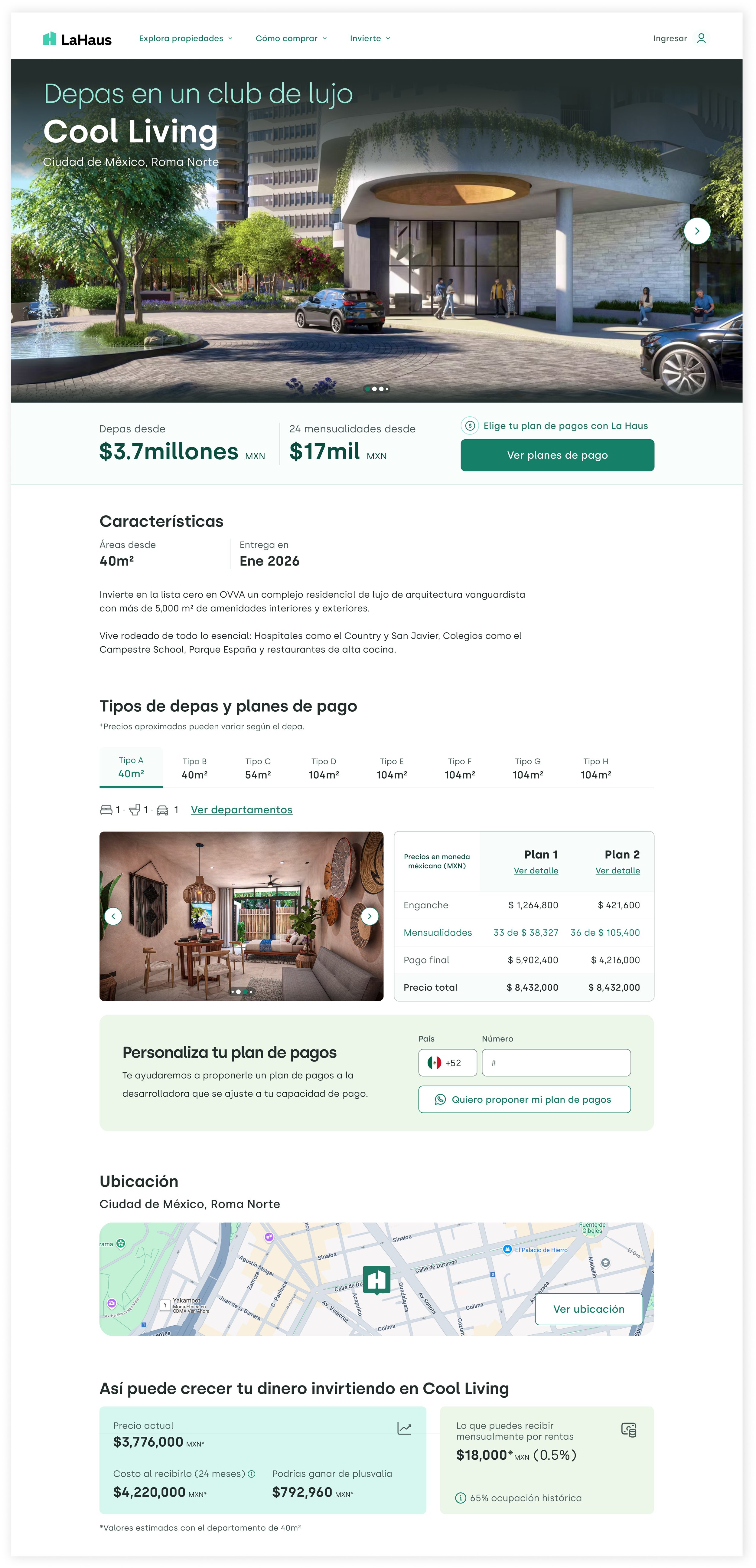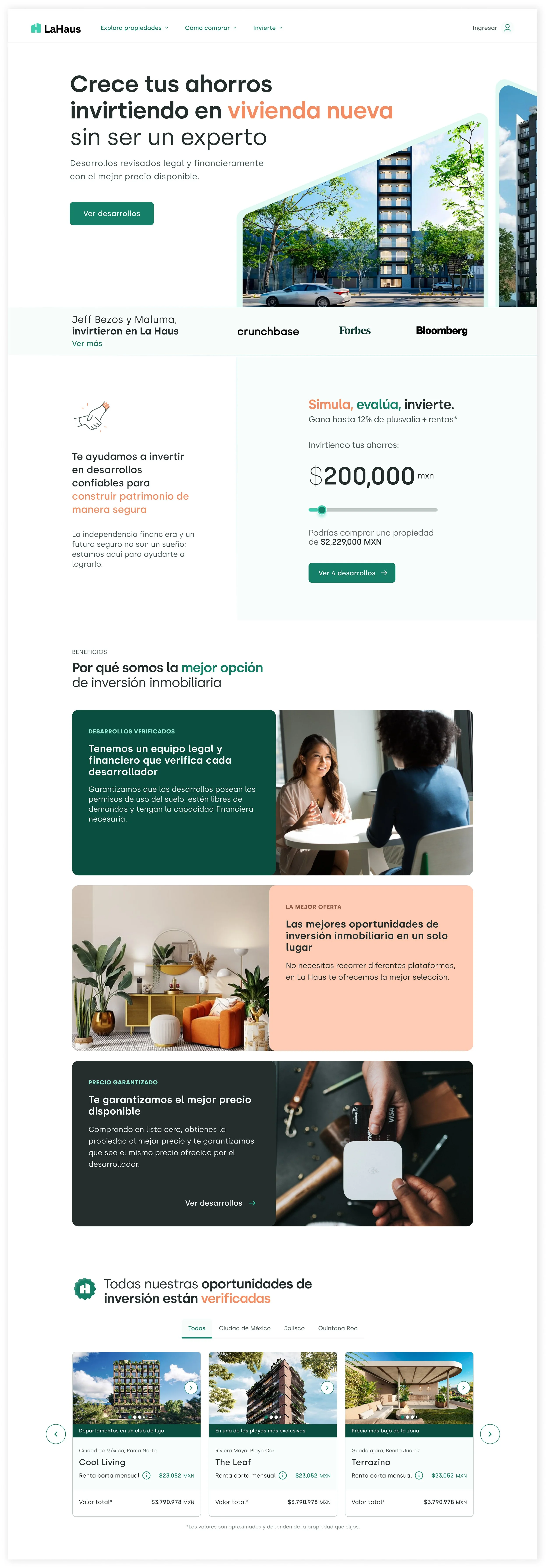 Diseñamos una experiencia completamente renovada que transmitiera accesibilidad a inversores sin experiencia y tranquilidad en la compra. Esta es la premisa del home: que el usuario entienda qué es La Haus, cómo puede ayudarlo y cómo invertir de manera fácil y segura en preventas.