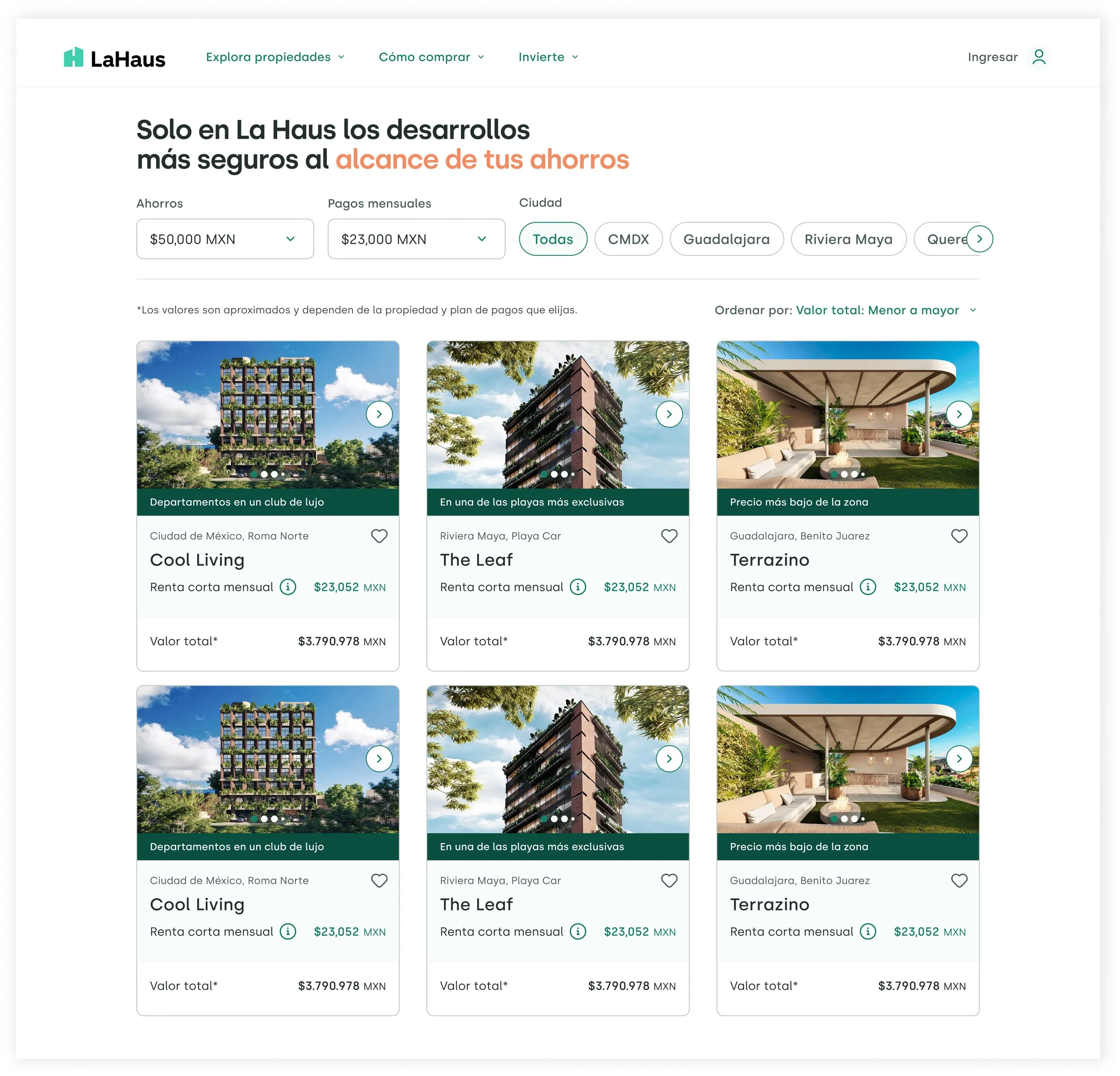 El nuevo diseño se enfocó en destacar datos clave: la rentabilidad que puede obtener el inversionista, el costo de la propiedad y el diferenciador de cada desarrollo; para ayudar a facilitar la toma de decisiones sobre qué desarrollos explorar en profundidad en la PDP.