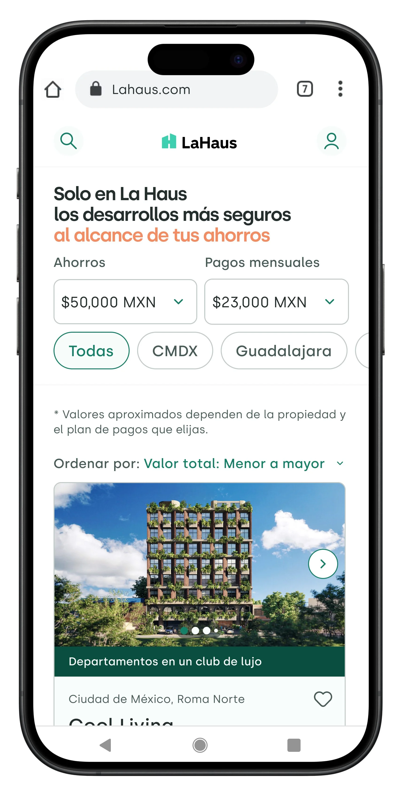 En cada punto de la experiencia del Home se debe transmitir seguridad a nuestros usuarios. Resaltamos en los títulos de las cards de desarrollos que toda nuestra oferta es verificada, reafirmando cómo La Haus alivia este importante dolor del inversionista explorador.